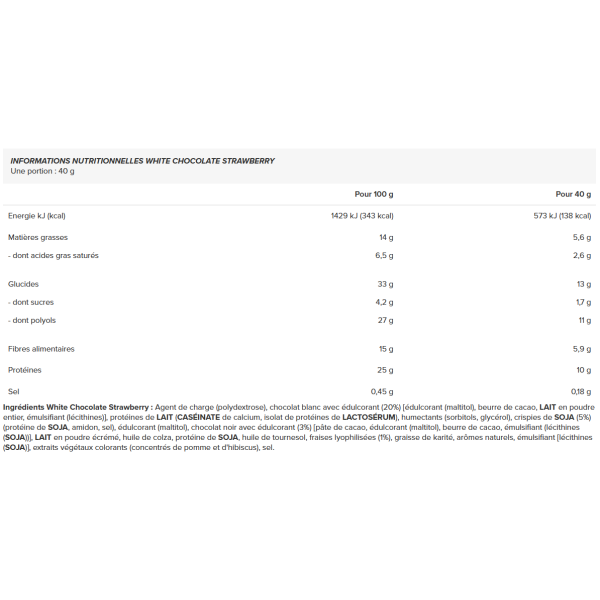 Ingredientes Chocolate blanco y fresa : Agente de carga (polidextrosa), chocolate blanco con edulcorante (20%) [edulcorante (maltitol), manteca de cacao, LECHE polvo, emulgente (lecitinas)], proteínas de LECHE (CASEINA aislado de proteínas, calcio LACTOSERUM), humectantes (sorbitoles, glicerol), crujientes de SOJA (5%) (proteína de SOJA, almidón, sal), edulcorante (maltitol), chocolate negro con edulcorante (3%) [pasta de cacao, edulcorante (maltitol), manteca de cacao, emulgente (lecitinas (SOJA))], LECHE polvo desnatado, aceite de colza, proteínas de SOJA, aceite de girasol, fresas liofilizadas (1%), manteca de karité, aromas naturales, emulgente [lecitinas (SOJA)], extractos de plantas colorantes (concentrados de manzana e hibisco), sal.
