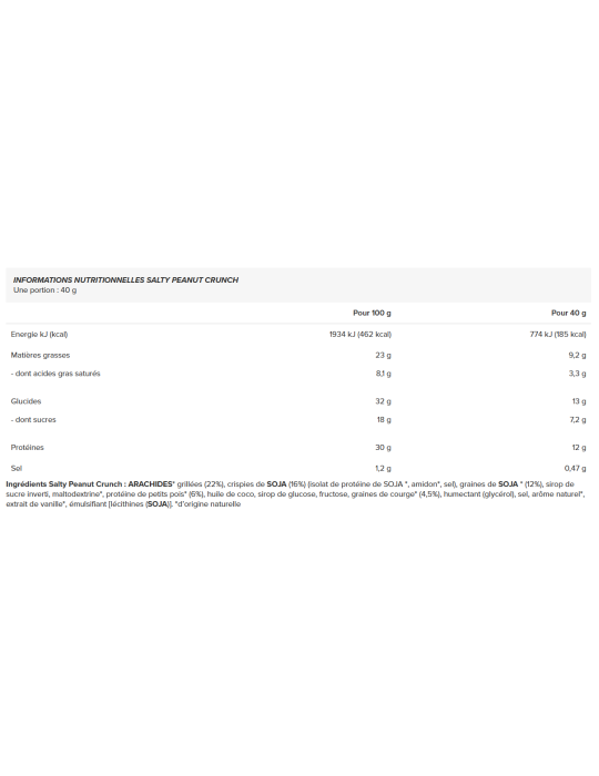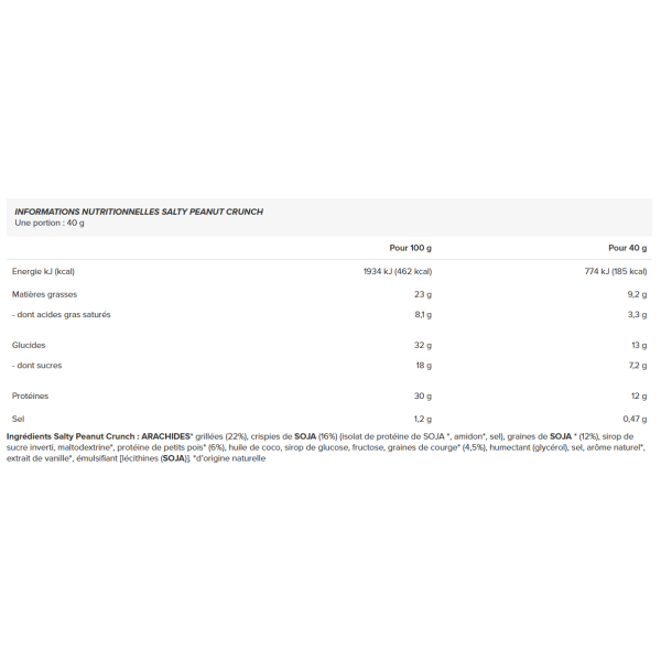 Ingredientes Crujiente de cacahuete salado : Cacahuetes tostados* (22%), crujientes de soja (16%) ( aislado de proteína de soja*, almidón*, sal), semillas de soja* (12%), jarabe de azúcar invertido, maltodextrina*, proteína de guisante* (6%), aceite de coco, jarabe de glucosa, fructosa, semillas de calabaza* (4,5%), humectante (glicerol), sal, aroma natural*, extracto de vainilla*, emulgente [lecitina(SOJA)]. *de origen natural