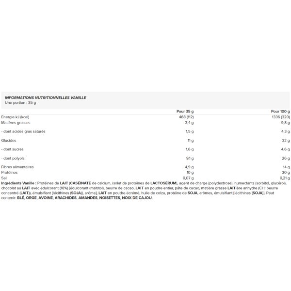 Ingredientes Vainilla: proteína de LECHE(CASEINATA cálcica, aislado de proteína de LACTOSERUM), agente de carga (polidextrosa), humectantes (sorbitol, glicerol), chocolate de LECHE con edulcorante (18%) [edulcorante (maltitol), manteca de cacao, LECHE entera en polvo, pasta de cacao, grasa de LECHEanhidra (CH: mantequilla concentrada(LECHE)), emulgente (lecitinas(SOJA)), aroma], LECHE desnatada en polvo, aceite de colza, proteína de SOJA, aroma, emulgente (lecitinas(SOJA)). Puede contener: TRIGO, CEBADA, AVENA, ARÁCIDAS, ALMENDRAS, CEREZAS, CASTAÑAS.