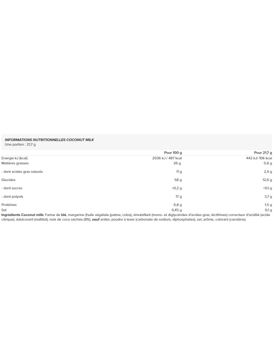 Ingredientes Leche de coco :Harina trigo, margarina (aceite vegetal (palma, colza), emulgente (mono y diglicéridos de ácidos grasos, lecitinas), regulador de la acidez (ácido cítrico), edulcorante (maltitol), coco deshidratado (8%), huevo harina integral, gasificante (carbonato sódico, difosfatos), sal, aroma, colorante (caroteno).