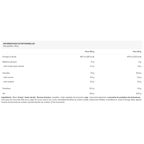 Ingredientes: clara de huevo, harina de trigo, avena integral, aceite vegetal de girasol, soja, glicerina humectante, concentrado de proteína de suero, trozos de chocolate 20% azúcar, pasta de cacao, manteca de cacao, emulgente lecitina (1), aroma de vainilla, edulcorante maltitol, acesulfamo K, ralladura de naranja, gasificantes bicarbonato sódico, pirofosfato sódico. (1) de girasol.