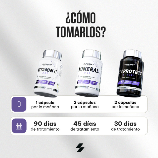 Este pack combina tres productos esenciales para reforzar sus defensas naturales, combatir la fatiga y proteger su organismo. Ideal para hacer frente a los cambios estacionales y preservar su energía a diario, le ofrece una solución completa para un sistema inmunitario fuerte y un metabolismo equilibrado.