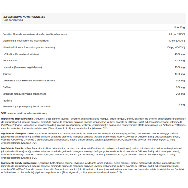 Ingredientes de Tropical Punch: L-citrulina, beta-alanina, taurina, l-tirosina, acidulantes (ácido málico, ácido cítrico), aroma, bitartrato de colina, antiaglomerante (dióxido de silicio [nano]), cafeína anhidra, extracto de semilla de mango silvestre(Irvingia gabonensis (Aubry-Lecomte ex O'Rorke) Baill.), edulcorante (sucralosa), vitamina C PureWay-C® (ácido L-ascórbico, citroflavonoides), niacina (nicotinamida), colorante (carmoisina) (la carmoisina puede tener efectos adversos sobre la actividad y la atención de los niños), piperina de pimienta negra(Piper nigrum L., fruto), cianocobalamina (vitamina B12).