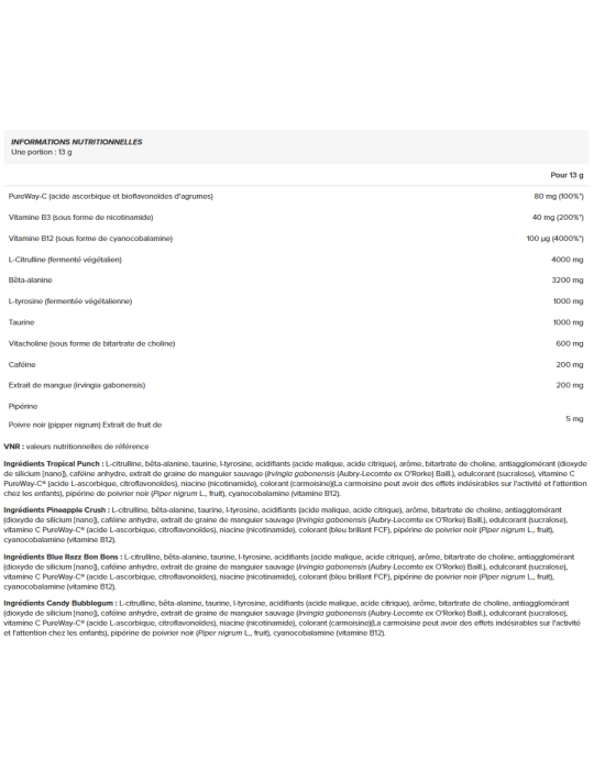 Ingredientes de Candy Bubblegum: L-citrulina, beta-alanina, taurina, l-tirosina, acidulantes (ácido málico, ácido cítrico), aroma, bitartrato de colina, antiaglomerante (dióxido de silicio [nano]), cafeína anhidra, extracto de semilla de mango silvestre(Irvingia gabonensis (Aubry-Lecomte ex O'Rorke) Baill.), edulcorante (sucralosa), vitamina C PureWay-C® (ácido L-ascórbico, citroflavonoides), niacina (nicotinamida), colorante (carmoisina) (la carmoisina puede tener efectos adversos sobre la actividad y la atención de los niños), piperina de pimienta negra(Piper nigrum L., fruto), cianocobalamina (vitamina B12).