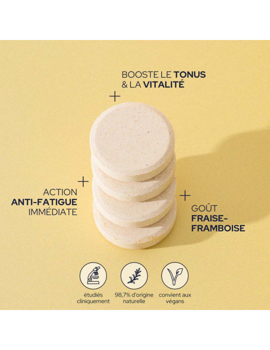 Su fórmula actúa en dos tiempos: un efecto inmediato gracias a su riqueza en vitaminas, para combatir el cansancio en cuanto aparece, y un efecto prolongado gracias a una planta adaptógena, que ayuda a su organismo a resistir mejor el estrés y la fatiga crónica.