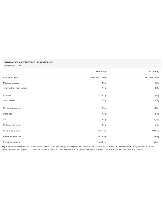 Ingredientes Manzana kiwi : Proteína de guisante - Espirulina en polvo (Spirulina platensis) - Aroma natural - Extracto de hoja de mate verde (Ilex paraguariensis A. St.-Hil.) - Agente espesante: goma de celulosa - Cafeína natural - Extracto de semilla de guaraná (Paullinia cupana Kunth) - Edulcorante: glucósidos de esteviol.