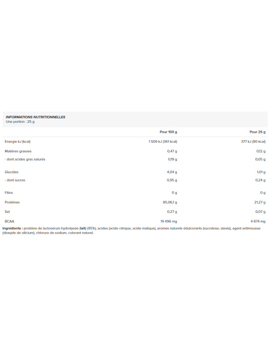 Ingredientes: proteína de suero hidrolizada(leche) (95%), ácidos (ácido cítrico, ácido málico), edulcorantes aromatizantes naturales (sucralosa, estevia), antiespumante (dióxido de silicio), cloruro de sodio, colorante natural.