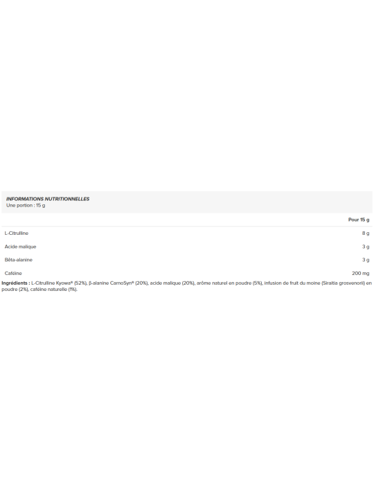 Ingredientes : Kyowa® L-Citrulina (52%), CarnoSyn® β-alanina (20%), ácido málico (20%), aroma natural en polvo (5%), infusión de fruta del monje (Siraitia grosvenorii) en polvo (2%), cafeína natural (1%).