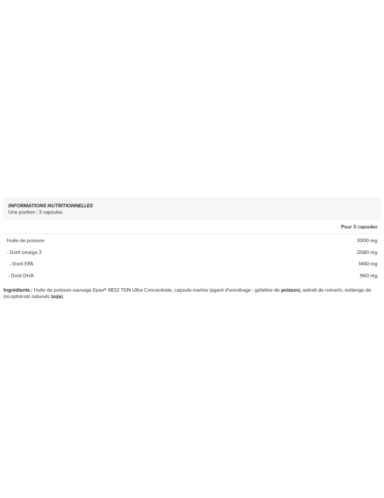 Ingredientes: Epax® 4832 TGN Ultra Concentrate aceite de pescado salvaje, cápsula marina (agente de recubrimiento: gelatina de pescado), extracto de romero, mezcla de tocoferoles naturales(soja).