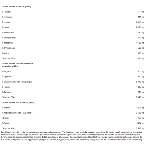 Ingredientes del chocolate :Proteína aislada desuero de lecheInstant 72% [aislado de proteínas lácteassuero de leche, emulgente: lecitinas (soja)], monohidrato de creatina micronizado 11,4%, cacao en polvo bajo en grasas, L-glutamina, aromas, espumante [grasa de coco parcialmente hidrogenada,lechePolvo, emulgentes (E471, E472a), jarabe de glucosa, sacarosa, proteína deleche, estabilizador (fosfatos potásicos)], emulgente: lecitinas (soja), espesantes (carragenina, goma xantana), L-arginina, sal, antiaglomerante (dióxido de silicio), L-triptófano, edulcorante (sucralosa), bisglicinato de zinc, niacina (nicotinamida, ácido nicotínico).