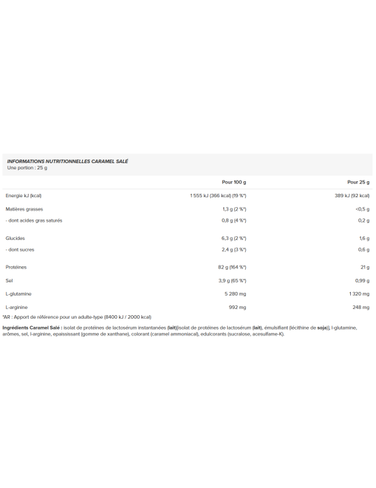 Ingredientes Caramelo salado : aislado de proteína suero de leche instantáneo (leche) [aislado de proteína de suero (leche), emulgente (lecitina de soja)], l-glutamina, aromas, sal, l-arginina, espesante (goma xantana), colorante (caramelo amoniacal), edulcorantes (sucralosa, acesulfamo-K).