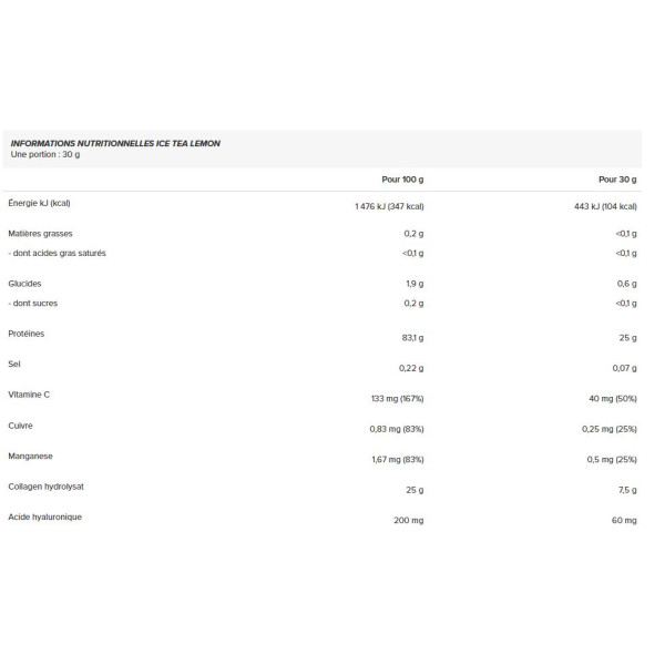Ingredientes - Té helado sabor limón: aislado de proteína de suero (71%), hidrolizado de colágeno [boeuf] (25%), aroma, agente antiespumante (antiaglomerante (dióxido de silicio), emulgente (monoestearato de sorbitán, lecitina de girasol), acidulante (ácido cítrico), edulcorante (sucralosa), hialuronato de sodio, colorante(sulfito de amonio - caramelo de azúcar), vitamina C, gluconato de manganeso, gluconato de cobre.