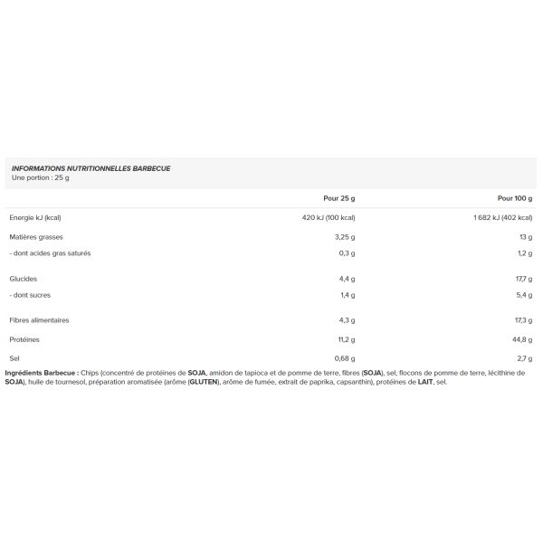 Ingredientes barbacoa: patatas fritas (concentrado de proteína de soja, almidón de tapioca y patata, fibra(soja), sal, copos de patata, lecitina de soja), aceite de girasol, preparado aromatizado (aroma(gluten), aroma de humo, extracto de pimentón, capsantina), proteína de LECHE, sal.