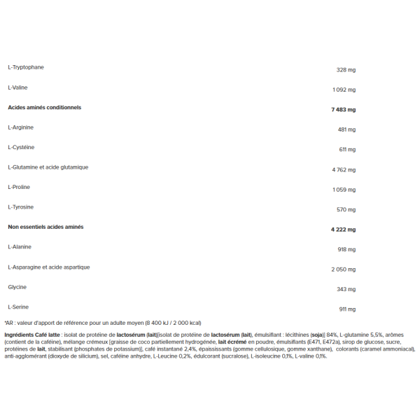 IngredientesCafé con lecheAislado de proteína suero de leche (leche)[aislado de proteína de suero de leche (leche), emulgente: lecitinas (soja)] 84%, L-glutamina 5,5%, aromas (contiene cafeína), mezcla cremosa [grasa de coco parcialmente hidrogenada, leche desnatada polvo, emulgentes (E471, E472a), jarabe de glucosa, azúcar, proteínas lácteas leche, estabilizador (fosfatos de potasio)], café instantáneo 2,4%, espesantes (goma de celulosa, goma xantana), colorantes (caramelo amoniacal), antiaglomerante (dióxido de silicio), sal, cafeína anhidra, L-leucina 0,2%, edulcorante (sucralosa), L-isoleucina 0,1%, L-valina 0,1%.