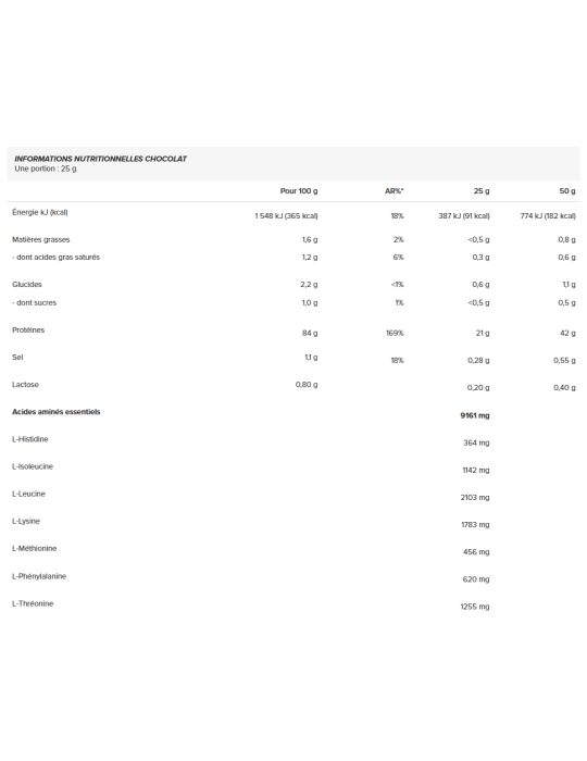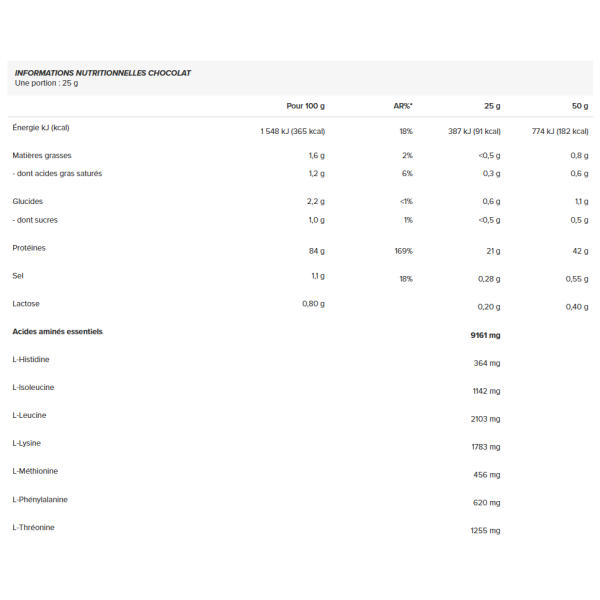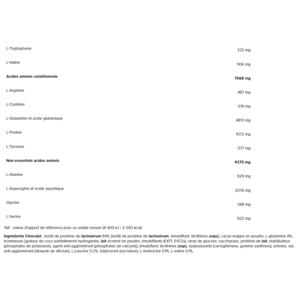 IngredientesChocolateAislado de proteínasuero de leche84% [aislado de proteína desuero de leche, emulgente: lecitinas (soja)], cacao en polvo bajo en grasas, L-glutamina 4%, agente espumante [grasa de coco parcialmente hidrogenada,lechePolvo, emulgentes (E471, E472a), jarabe de glucosa, sacarosa, proteína deleche, estabilizador (fosfatos de potasio), antiaglomerante (fosfatos de calcio)], emulgente: lecitinas (soja), espesantes (carragenina, goma xantana), aromas, sal, antiaglomerante (dióxido de silicio), L-leucina 0,2%, edulcorante (sucralosa), L-isoleucina 0,1%, L-valina 0,1%.