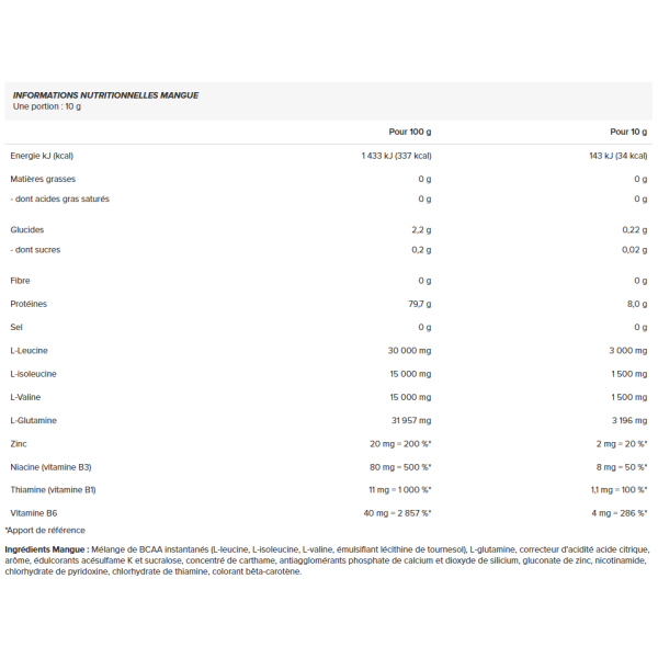 Ingredientes Mango : mezcla instantánea de BCAA (L-leucina, L-isoleucina, L-valina, emulgente lecitina de girasol), L-glutamina, regulador de la acidez ácido cítrico, aroma, edulcorantes acesulfamo K y sucralosa, concentrado de cártamo, antiaglomerantes fosfato de calcio y dióxido de silicio, gluconato de zinc, nicotinamida, clorhidrato de piridoxina, clorhidrato de tiamina, colorante beta-caroteno.