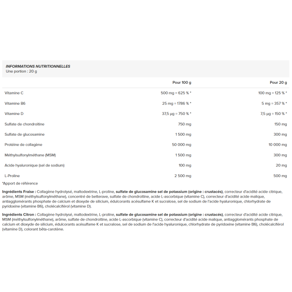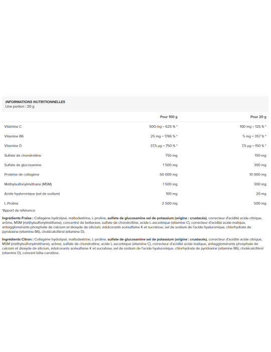 Ingredientes Fresa: colágeno hidrolizado, maltodextrina, L-prolina, sal potásica de sulfato de glucosamina (origen : marisco), regulador de la acidez ácido cítrico, aroma, MSM (metilsulfonilmetano), concentrado de remolacha, condroitín sulfato, ácido L-ascórbico (vitamina C), regulador de la acidez ácido málico, antiaglomerantes fosfato de calcio y dióxido de silicio, edulcorantes acesulfamo K y sucralosa, sal sódica de ácido hialurónico, clorhidrato de piridoxina (vitamina B6), colecalciferol (vitamina D).