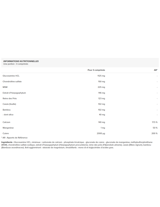 Ingredientes: glucosamina HCL, minerales: carbonato cálcico - fosfato tricálcico - gluconato de cobre - gluconato de manganeso, metilsulfonilmetano (MSM), condroitín sulfato sódico, extracto de harpagofito(Harpagophytum procumbens),ulmaria (Filipendula ulmaria), grosellero negro(Ribes nigrum), bambú(Bambusa arundinacea). Antiaglomerante: estearato de magnesio, emulgentes: mono di y triglicéridos de ácidos grasos.