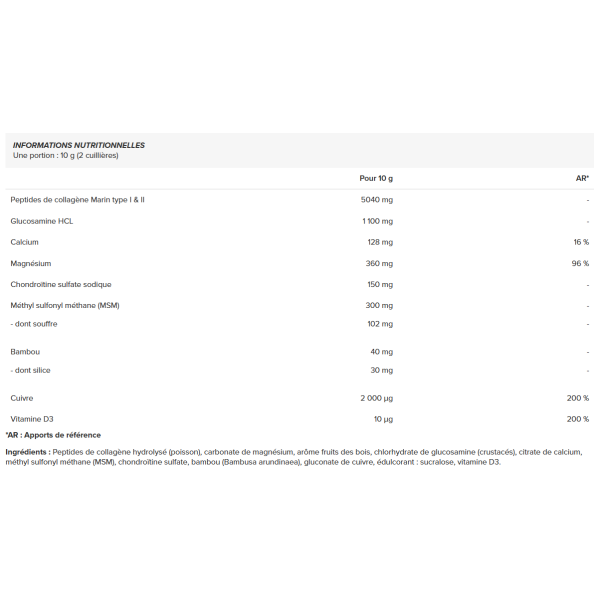 Ingredientes : Péptidos de colágeno hidrolizados(pescado), carbonato de magnesio, aroma de bayas silvestres, clorhidrato de glucosamina(marisco), citrato de calcio, metilsulfonilmetano (MSM), condroitín sulfato, bambú(Bambusa arundinaea), gluconato de cobre, edulcorante: sucralosa, vitamina D3.