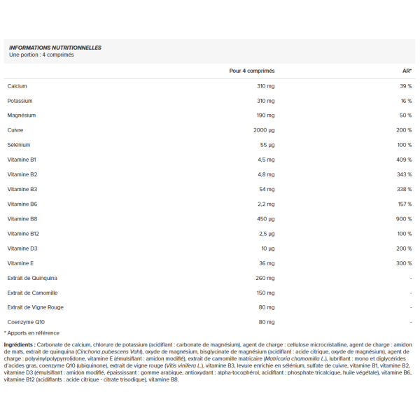 Ingredientes: carbonato cálcico, cloruro potásico (acidificante: carbonato magnésico), agente de carga: celulosa microcristalina, agente de carga: almidón de maíz, extracto de quina(Cinchona pubescens Vahl), óxido magnésico, bisglicinato magnésico (acidificante: ácido cítrico, óxido de magnesio), agente de carga: polivinilpolipirrolidona, vitamina E (emulgente: almidón modificado), extracto de manzanilla(Matricaria chamomilla L.), lubricante: mono y diglicéridos de ácidos grasos, coenzima Q10 (ubiquinona), extracto de vid roja(Vitis vinifera L.), vitamina B3, levadura enriquecida con selenio, sulfato de cobre, vitamina B1, vitamina B2, vitamina D3 (emulgente: almidón modificado, espesante: goma arábiga, antioxidante: alfa-tocoferol, acidulante: fosfato tricálcico, aceite vegetal), vitamina B6, vitamina B12 (acidulantes: ácido cítrico - citrato trisódico), vitamina B8.