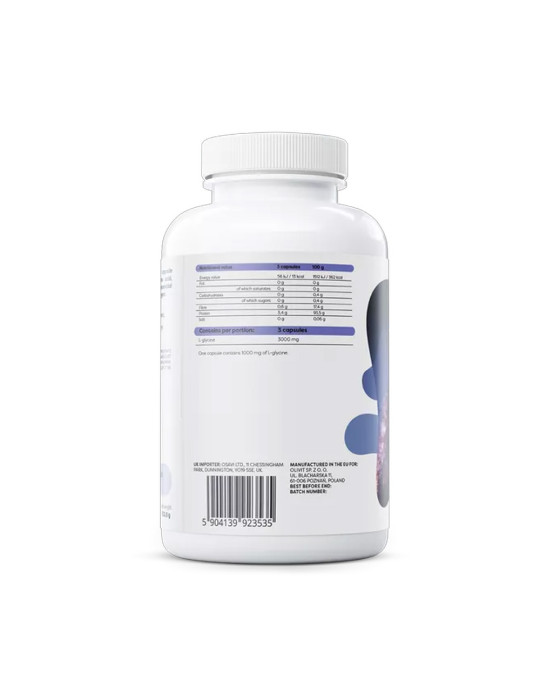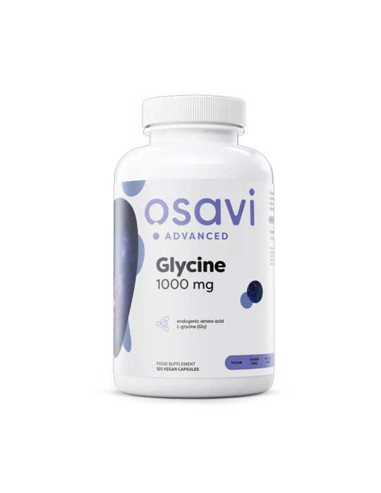 Glicina (120 cápsulas) deOsavi glicina es un complemento alimenticio con una dosis ultra elevada de L-glicina pura (1000 mg por cápsula), un aminoácido fundamental tanto para la síntesis de proteínas, en particular el colágeno, como para el funcionamiento del sistema nervioso, donde actúa como neurotransmisor calmante.