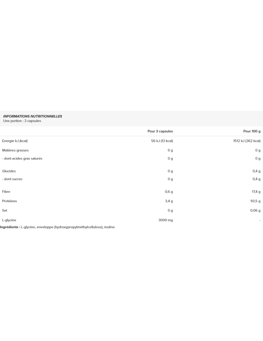 Ingredientes: L-glicina, cáscara (hidroxipropilmetilcelulosa), inulina.