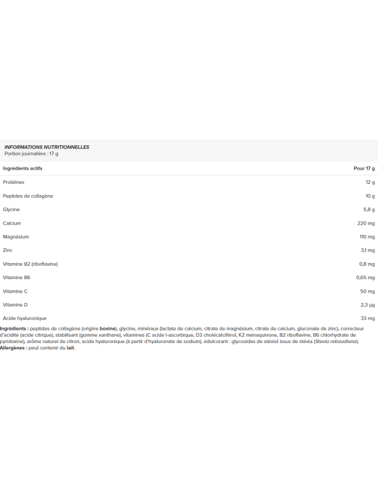 Ingredientes : péptidos de colágeno (origen bovino), glicina, minerales (lactato de calcio, citrato de magnesio, citrato de calcio, gluconato de zinc), regulador de la acidez (ácido cítrico), estabilizador (goma xantana), vitaminas (ácido C l-ascórbico, D3 colecalciferol, K2 menaquinona, B2 riboflavina, B6 clorhidrato de piridoxina), aroma natural de limón, ácido hialurónico (de hialuronato sódico), edulcorante : glucósidos de esteviol de stevia(Stevia rebaudiana).