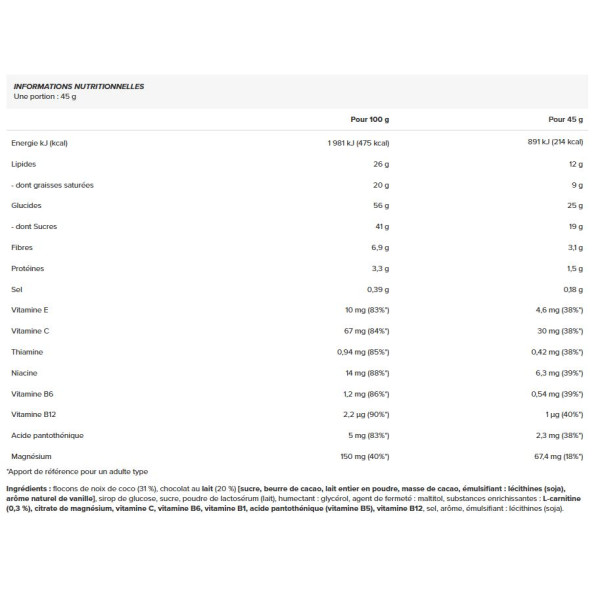 Ingredientes: copos de coco (31%), chocolate con leche (20%) [sucre, beurre de cacao, lait entier en poudre, masse de cacao, émulsifiant : lécithines (soja), arôme naturel de vanille]jarabe de glucosa, azúcar, suero de leche en polvo (leche), humectante: glicerol, agente endurecedor: maltitol, sustancias enriquecedoras: L-carnitina (0,3%), citrato de magnesio, vitamina C, vitamina B6, vitamina B1, ácido pantoténico (vitamina B5), vitamina B12, sal, aroma, emulgente: lecitina (soja).