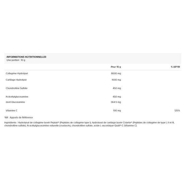 Ingredientes: Peptan® hidrolizado de colágeno bovino (péptidos de colágeno de tipo I), Colartix® hidrolizado de cartílago bovino (péptidos de colágeno de tipo I, II y III, condroitín sulfato), N-acetilglucosamina natural (crustáceos), condroitín sulfato, Quali®-C ácido L-ascórbico (Vitamina C)