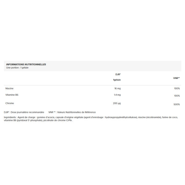 Ingredientes: Agente de carga: goma de acacia, cápsula vegetal (agente de recubrimiento: hidroxipropilmetilcelulosa), niacina (nicotinamida), harina de coco, vitamina B6 (piridoxal 5'-fosfato), picolinato de cromo CrPix .