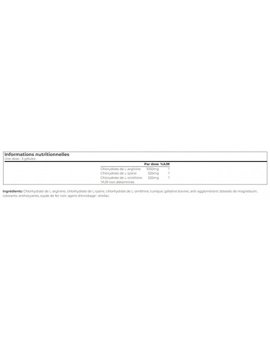 Ingredientes: hidrocloruro de L-arginina, hidrocloruro de L-lisina, hidrocloruro de L-ornitina, recubrimiento: gelatina bovina, antiaglomerante: estearato de magnesio, colorantes: antocianinas, óxido de hierro negro; agente de recubrimiento: goma laca.