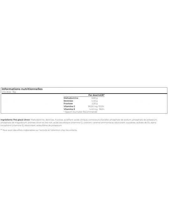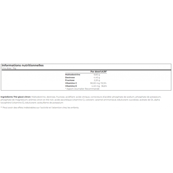 Ingredientes Té helado de limón: Maltodextrina, dextrosa, fructosa, acidulante (ácido cítrico), hidrogenofosfato disódico, dihidrogenofosfato de potasio, hidrogenofosfato de magnesio, aromas (limón, té negro), ácido ascórbico, colorante (caramelo), edulcorante (sucralosa, acesulfamo K), acetato de DL-alfa tocoferol .