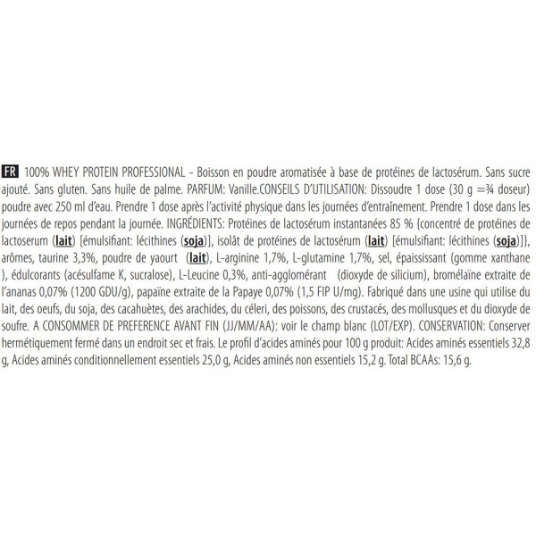 Obtenida de la leche, 100% Whey Protein Professional se considera una proteína completa, ya que aporta al organismo todos los aminoácidos esenciales, incluidos los 8 aminoácidos esenciales y los BCAA que el organismo no es capaz de sintetizar y que deben ser aportados por la alimentación (histidina, isoleucina, leucina, lisina, metionina, fenilalanina, treonina, triptófano y valina).
