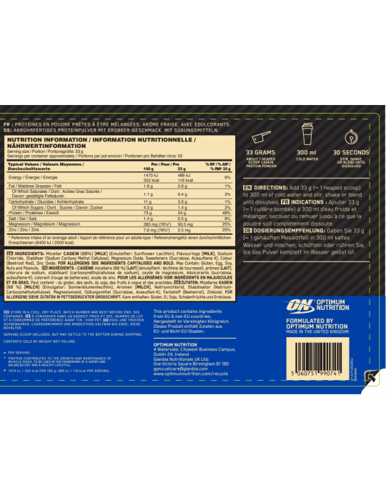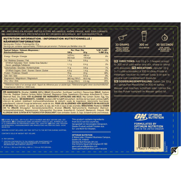 Optimum Nutrition100%Casein Gold es la más beneficiosa de las proteínas de liberación retardada . Mientras que la proteína de suero de leche es deseable justo antes y justo después del ejercicio, la proteína 100% Casein Gold es deseable para el resto del día.