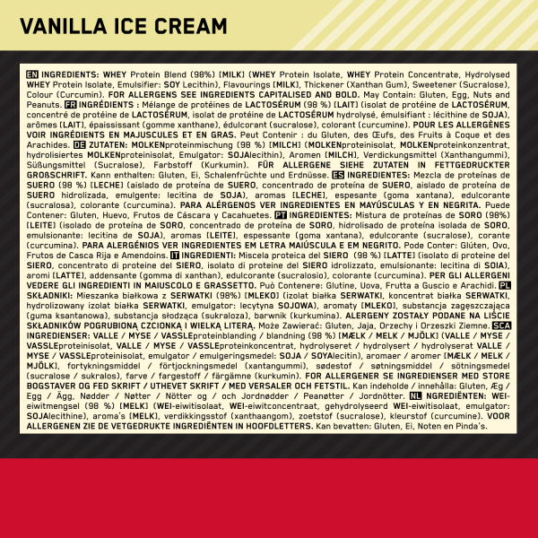 Ingredientes Vainilla :Mezcla de proteínas de LACTOSERUM (98%) [LECHE] (proteína aislada de LACTOSERUM, concentrado de proteínas LACTOSERUM, aislado de proteína LACTOSERUM hidrolizada, emulgente: lecitina de SOJA), aromas, cloruro sódico, espesante (goma xantana), edulcorante (sucralosa), colorante (curcumina).