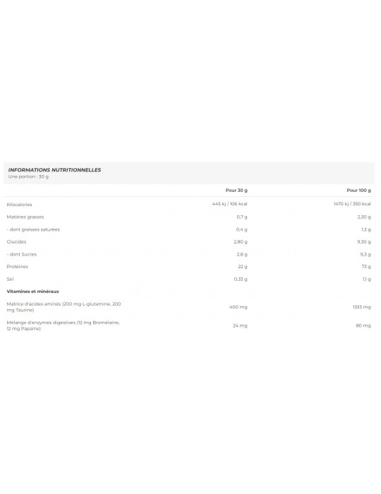 Ingredienti del cioccolato : complesso proteico del latte (concentrato di caseina micellare e caseinato di calcio), cacao sgrassato in polvere (10-12%), destrosio, aroma (cioccolato), cloruro di sodio, L-glutammina, taurina, edulcoranti (acesulfame K, sucralosio), bromelina estratta da Ananas comosus (1200 GDU/g), papaina estratta da Carica papaya (1,5 FIP u/mg).