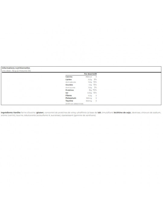 Ingredienti Vaniglia: farina di avena (glutine), proteine del siero del latte concentrate ultrafiltrate ( a base di latte, emulsionante: lecitina di soia), destrosio, cloruro di sodio, aroma (vaniglia), taurina, edulcoranti (acesulfame K, sucralosio), addensante (gomma di xantano).