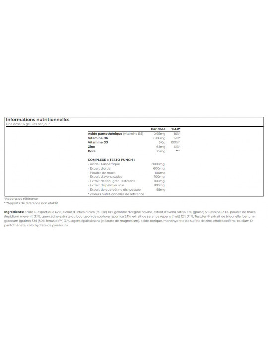 Assunzioni di riferimento ***Assunzioni di riferimento non stabiliteIngredienti: acido D-aspartico 62%, estratto di urtica dioica (foglia) 10:1, gelatina di origine bovina, estratto di avena sativa 19% (seme) 5:1 (avena) 3,1%, polvere di maca (lepidium meyenii) 3,1%, quercetina estratta dalla gemma di sophora japonica 3.1%, estratto di serenoa repens (frutto) 12:1, 3,1%, Testofen® trigonella foenum.1%, estratto di serenoa repens (frutto) 12:1, 3,1%, estratto di Testofen® trigonella foenum-graecum (seme) 33:1 (50% fenuside™) 3,1%, addensante (stearato di magnesio), acido borico, solfato di zinco monoidrato, colecalciferolo, calcio D-pantotenato, piridossina cloridrato.