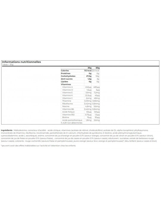 Ingredienti: Maltodestrina, regolatore di acidità - acido citrico, vitamine (acetato di retinolo, colecalciferolo, acetato di DL-alfa-tocoferolo, fillochinone, mononitrato di tiamina, riboflavina, nicotinamide, pantotenato di D-calcio, piridossina cloridrato, D-biotina, acido pteroilmonoglutammico, cianocobalamina, acido L-ascorbico), aroma, succo d'arancia concentrato in polvere 0,1% (aroma d'arancia), succo di limone concentrato in polvere 0,1% (aroma di limone), fragola e fragole.1% (aroma di limone), succo concentrato di fragola in polvere 0,1% (aroma di fragola), succo concentrato di ribes nero in polvere 0,1% (aroma di ribes nero), edulcorante: sucralosio, estratto di barbabietola rossa (aroma di ribes nero), coloranti: rosso cocciniglia (aroma di fragola e pompelmo), giallo arancio (aroma di kiwi, arancia e pompelmo)*, blu brillante (aroma di ribes nero e kiwi).