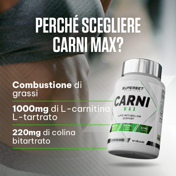 Con i suoi 682 mg di L-carnitina per dose, CARNI MAX (60 CAPS) può essere un alleato ideale da inserire nella routine di preparazione pre-esercizio, contribuendo a ottimizzare le prestazioni fisiche. Per massimizzare i risultati, si consiglia di associarlo a una dieta equilibrata e a un programma di esercizio fisico adeguato.