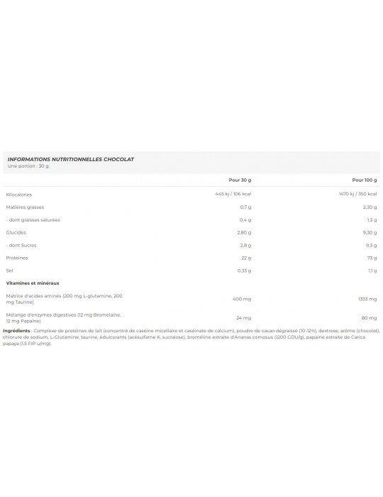 Ingredienti : Complesso proteico del latte (concentrato di caseina micellare e caseinato di calcio), cacao sgrassato in polvere (10-12%), destrosio, aroma (cioccolato), cloruro di sodio, L-glutammina, taurina, edulcoranti (acesulfame K, sucralosio), bromelina estratta da Ananas comosus (1200 GDU/g), papaina estratta da Carica papaya (1,5 FIP u/mg).