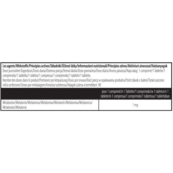 Ingredienti: agenti di carica (fosfati di calcio, gel di cellulosa, carbossimetilcellulosa reticolata Dosium), melatonina 0,5%, agente antiagglomerante (sali di magnesio degli acidi grassi).