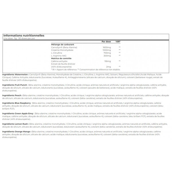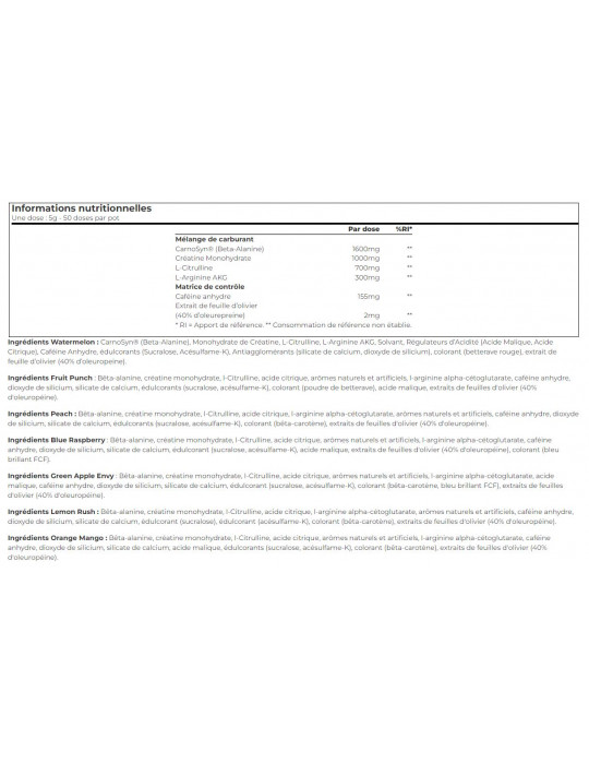 Ingredienti del Fruit Punch: Beta-alanina, creatina monoidrato, l-citrullina, acido citrico, aromi naturali e artificiali, l-arginina alfa-chetoglutarato, caffeina anidra, biossido di silicio, silicato di calcio, edulcoranti (sucralosio, acesulfame-K), colorante (barbabietola in polvere), acido malico, estratto di foglie di olivo (40% di oleuropeina).