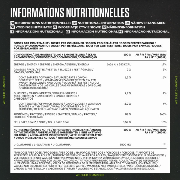 Ingredienti Vaniglia : proteine isolate del siero di latte istantanee (latte) {proteine isolate di frumento (latte), emulsionante [lecitine (soia)]} 87%, L-glutammina 5,5%, aromi, zucchero di canna {saccarosio, sciroppo di glucosio, grasso di palma, zucchero in polvere, ecc.} latte intero, emulsionante [lecitine (soia)], aromi}, formaggio cagliato in polvere (latte), edulcoranti (sucralosio, acesulfame K), proteine del siero di latte idrolizzate istantaneamente (latte) {proteine isolate del siero di latte idrolizzate (latte), emulsionante [lecitine (soia)]} 0,15%.