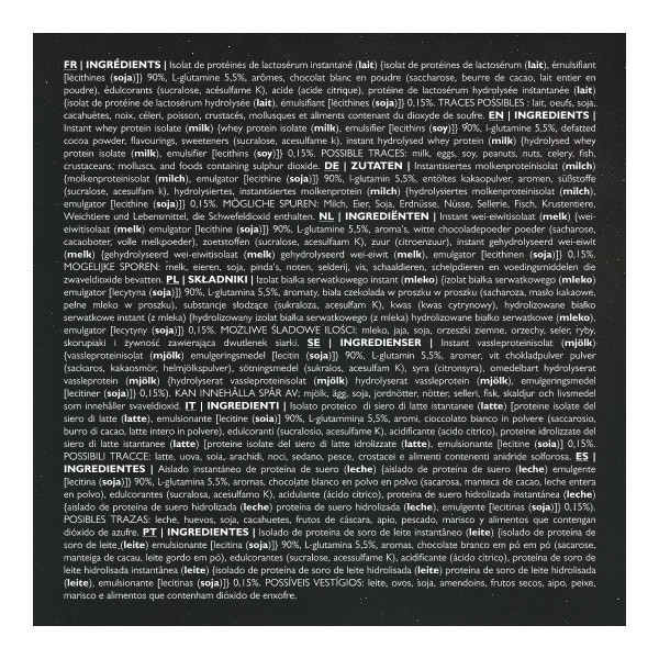 Ingredienti Cioccolato :Proteine isolate del siero di latte istantanee (latte) {proteine isolate di frumento (latte), emulsionante [lecitine (soia)]} 84%, L-glutammina 5,5%, cacao sgrassato in polvere, aromi, cioccolato fondente latte cioccolato in polvere latte (saccarosio, cacao in polvere sgrassato, latte polvere, burro di cacao), aroma naturale, sale], edulcoranti (sucralosio, acesulfame K), proteine del siero di latte idrolizzate istantanee (latte) {proteine isolate del siero di latte idrolizzate (latte), emulsionante [lecitine (soia)]} 0,15%.