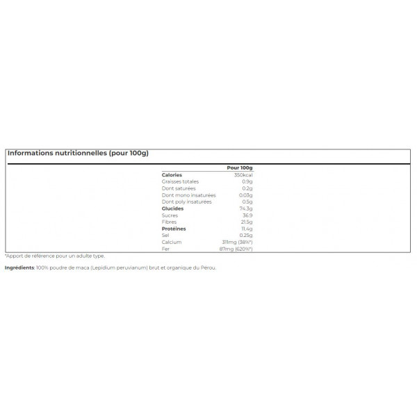 La maca è un integratore alimentare fonte di energia e ricco di benefici. La Maca, nota anche come ginseng peruviano, è un potente tonico generale che agisce un po' come una pianta adattogena. Ricca di proteine e vitamina C, la polvere di Maca contiene anche antiossidanti, calcio e magnesio. La presenza di grassi buoni omega-3 aiuta a ridurre lo stress.