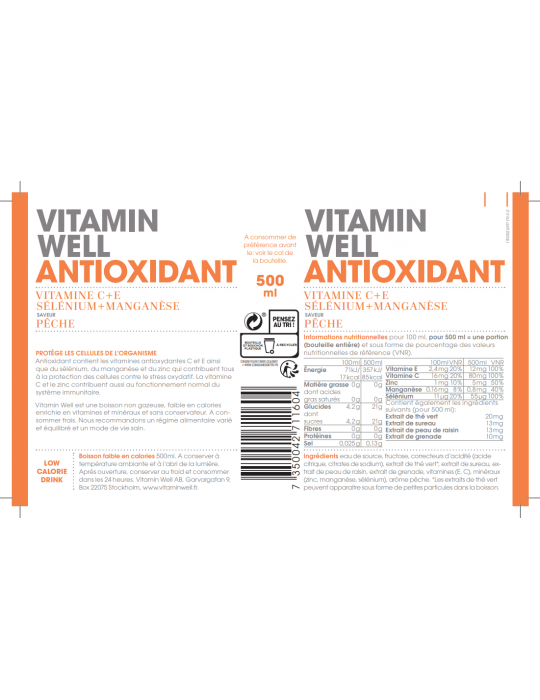 VITAMIN WELL ANTIOXIDANT è una formula completa contenente vitamine C + E, selenio e manganese. VITAMIN WELL ANTIOXIDANT è disponibile al gusto Pesca, fresco e gradevole al palato, come un tè freddo.