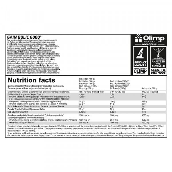 Gain Bolic 6000 è considerato un eccellente integratore di peso, in particolare perché offre la proporzione perfetta di carboidrati e lipidi per un rapido aumento di peso. Questo weight gainer del marchio Olimp è un integratore alimentare che fornisce una quantità significativa di calorie per aiutare ad aumentare il peso corporeo, integrando al contempo l'apporto proteico durante la giornata.