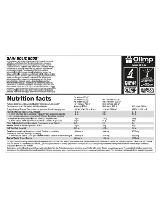 La formula del gainer Gain Bolic 6000 è inoltre arricchita con creatina monoidrato, il cui ruolo è quello di fornire energia alle cellule durante gli sforzi brevi e intensi per aiutare a guadagnare in intensità, e taurina, un aminoacido solforato prodotto naturalmente dall'organismo.