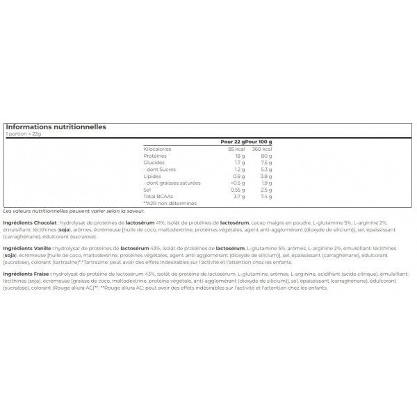 [huile de coco, maltodextrine, protéines végétales, agent anti-agglomérant (dioxyde de silicium)]Ingredienti Cioccolato : idrolizzato di proteine del siero di latte 41%, proteine del siero di latte isolate, cacao magro in polvere, L-glutammina 5%, L-arginina 2%, emulsionante: lecitina(soia), aromi, agente scremante, sale, addensante (carragenina), edulcorante (sucralosio).